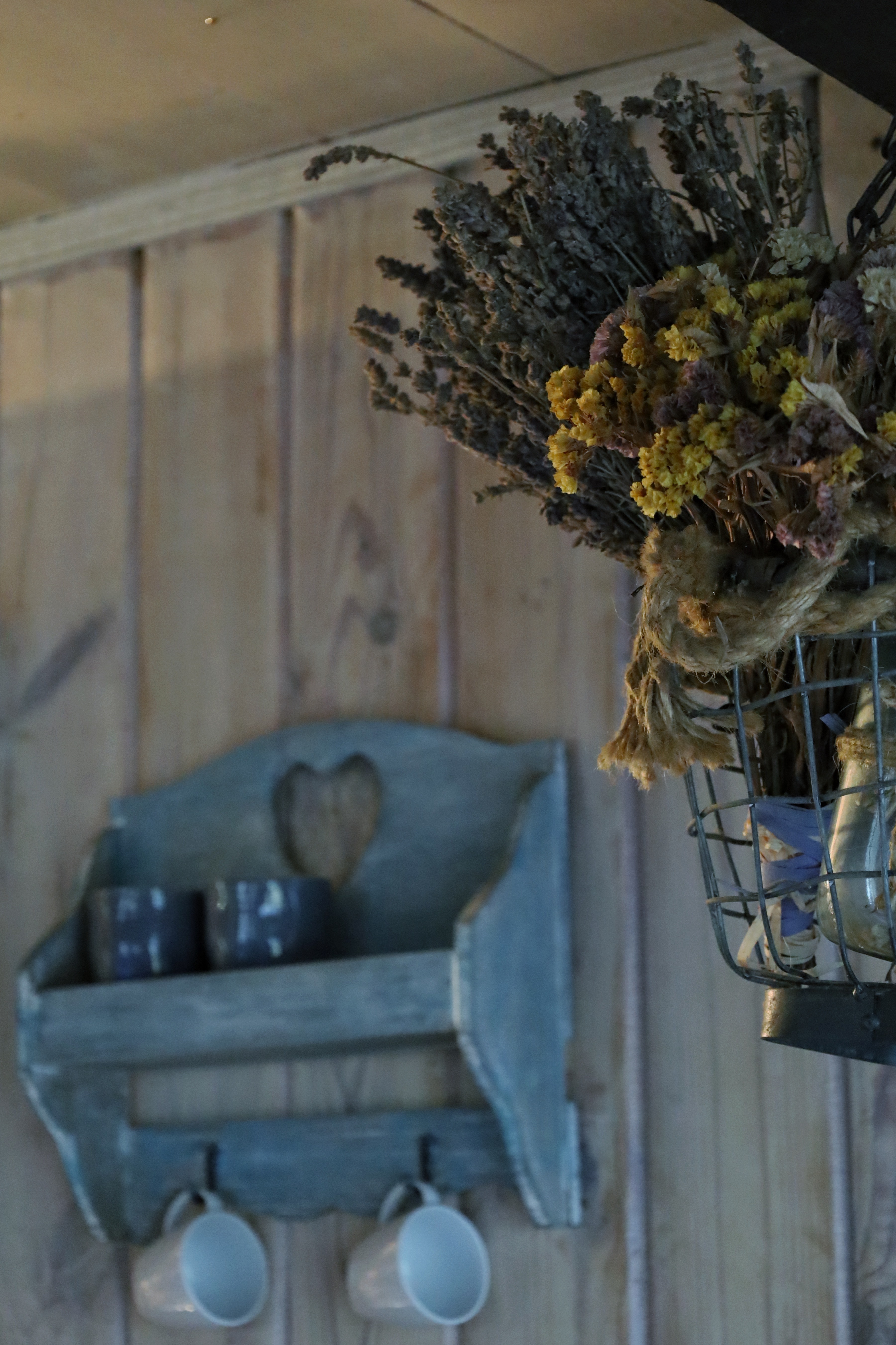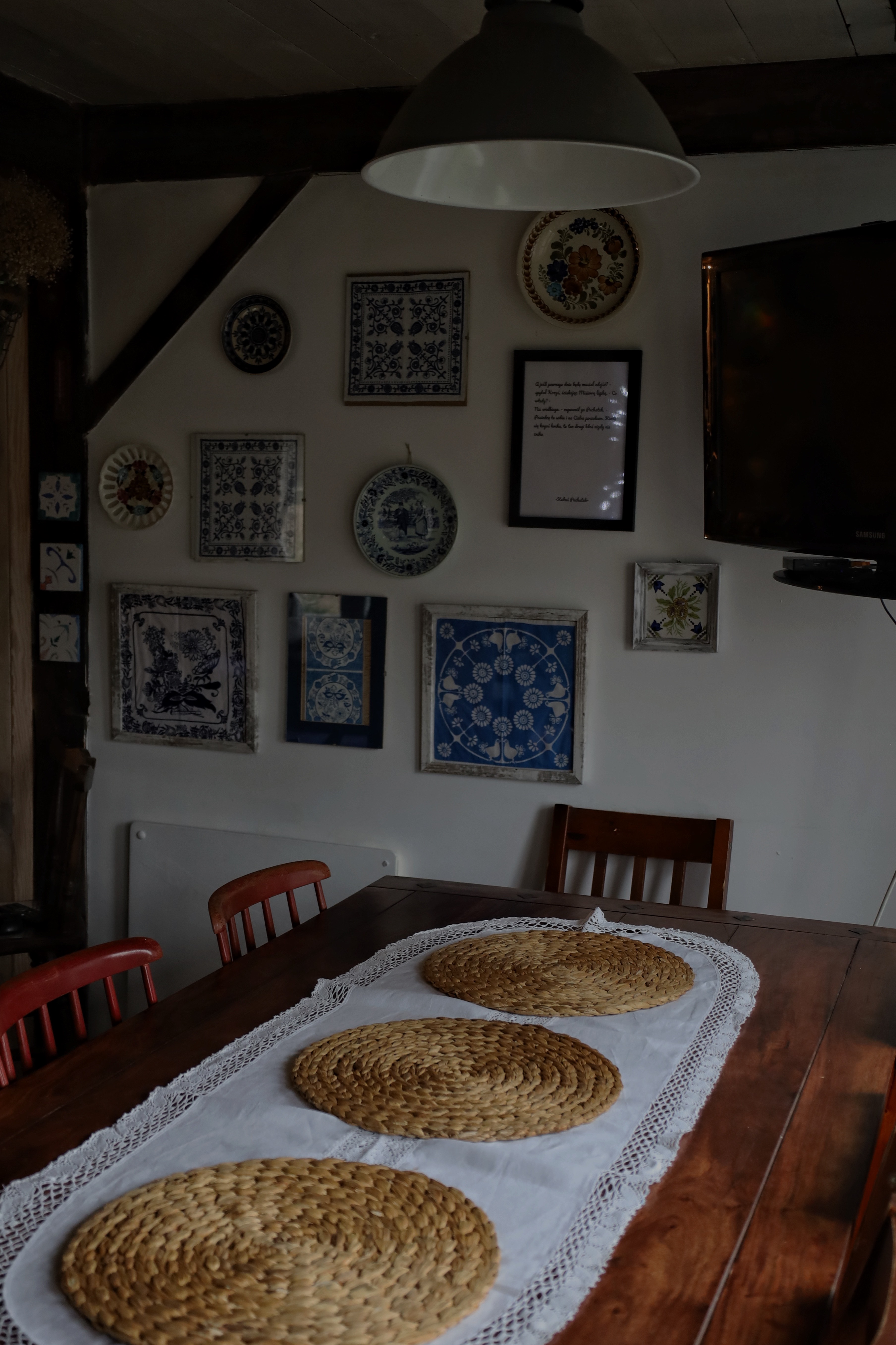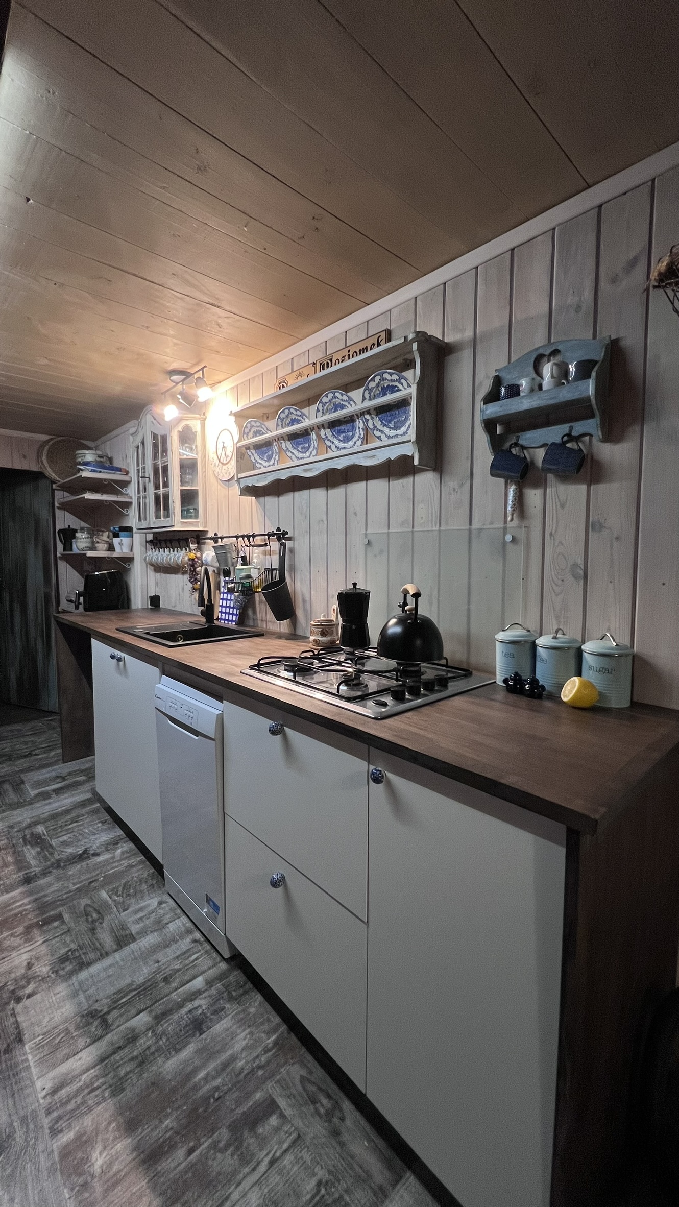 Aneks kuchenny wyposażony jest w płytę gazową czteropalnikową, zmywarkę, air fryer, garnki, patelnie, kubki, szklanki, talerze i wszystko co niezbędne do przygotowania posiłków. Centralny punkt, a zarazem serce domku stanowi kominek typu koza, który nadaje klimat pomieszczeniu.